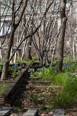 Trees growing among the abandoned railroad tracks in the High Line park, a former elevated freight rail line in New York City.