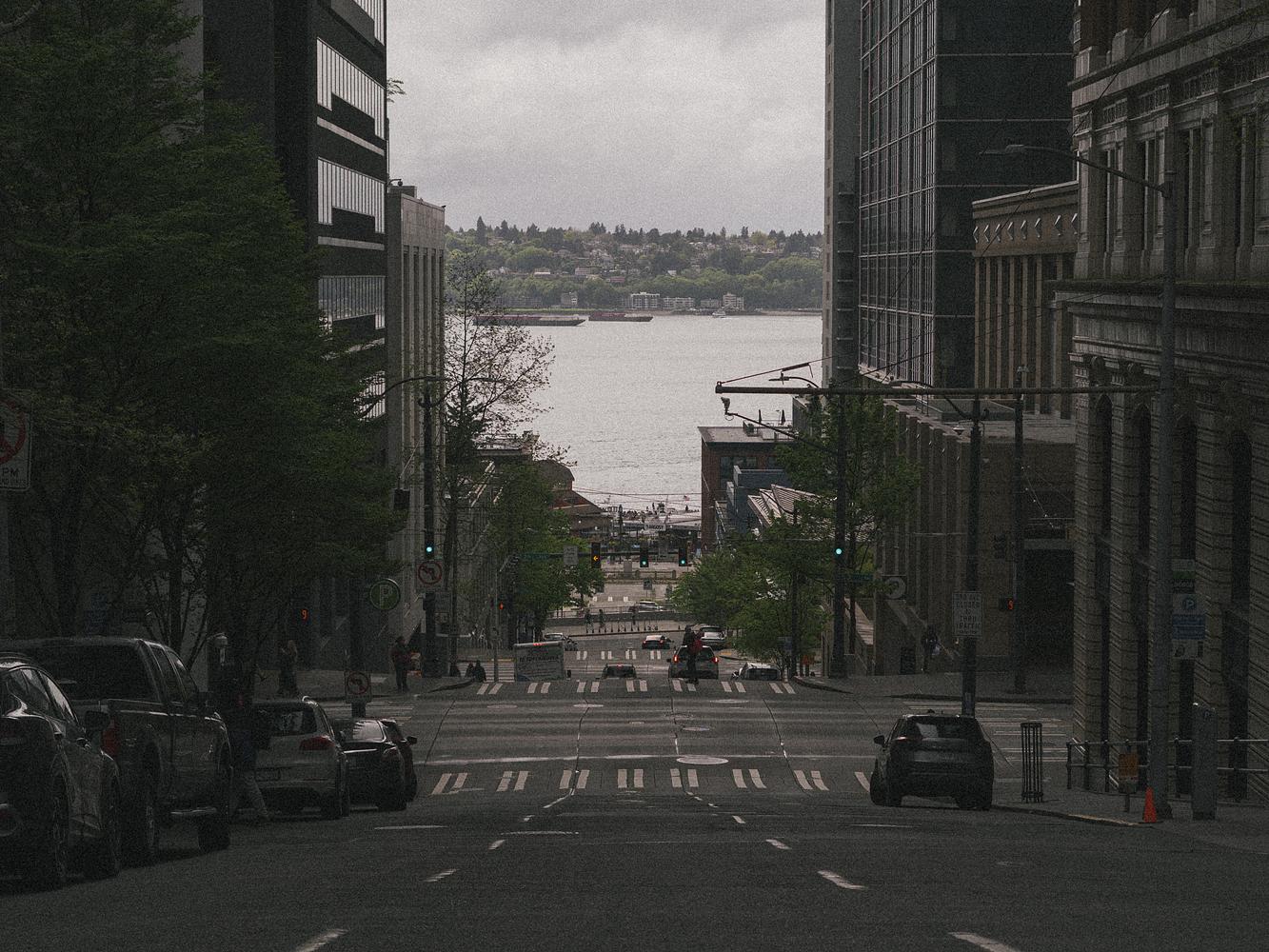 A view down a street in Seattle. this is not shot on film but is meant to evoke the look of film through colors and texture.