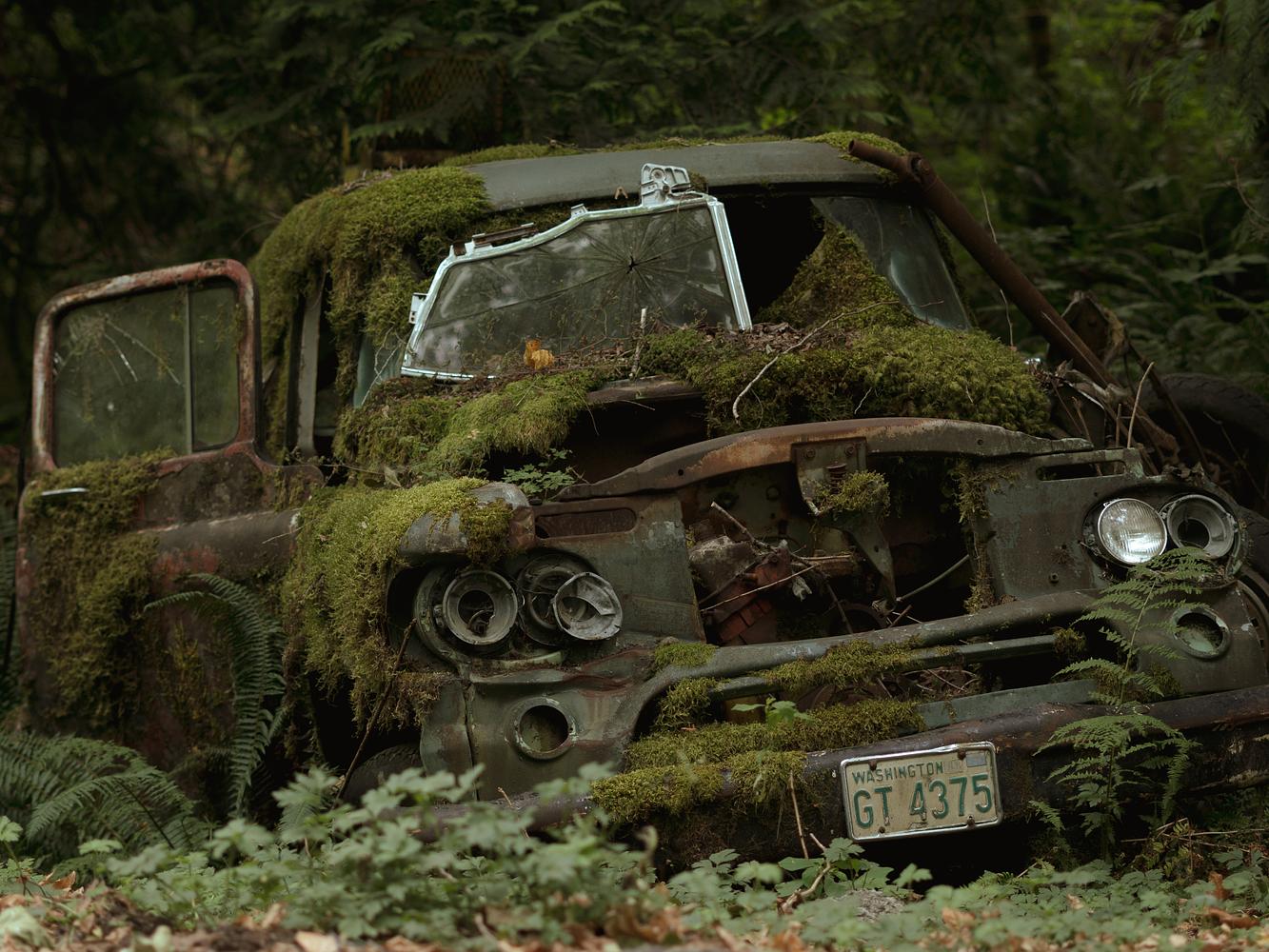 An old rusted out car on the side of the road. The license plate is from sometime between 1968 and 1982.